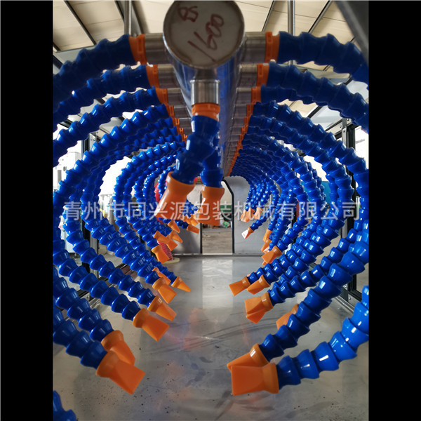 該機主要用于粘貼不干膠商標前瓶子的吹干。該機必須與流水線相配套使用,實現(xiàn)自動流水作業(yè)。