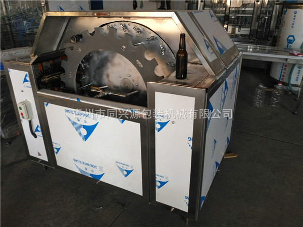本機采用旋轉式,兩邊同時工作,瓶子進入內刷后,由內刷盤帶動瓶子旋轉。瓶子底部設有固定底刷,四周按有旋轉外刷,并且裝有噴水頭,在刷洗瓶子內部的同時,外部、底部、瓶口處都能同時清刷,從而達到一次性刷洗潔凈的目的,并可刷洗各種異型瓶。