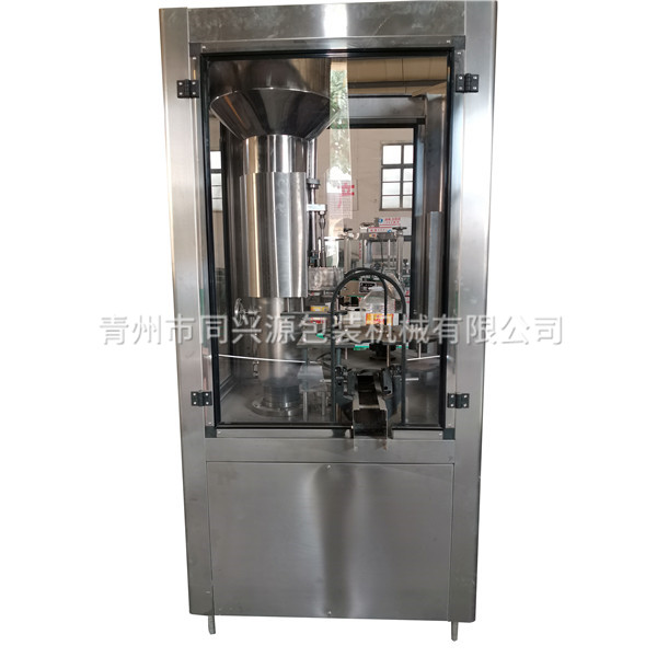 該機的縮塞機均采用獨立式擠壓頭,縮塞塊采用特殊材質并進行了淬火處理,保證了硬度,打塞時不掉渣,使用壽命長,且無瓶不落塞。中間支柱為可調式,可滿足瓶子高低不同的要求。采用連續運轉時進出瓶裝置,在進出瓶拔瓶盤處設有離合保護裝置,出現卡瓶時,自動停機,確保生產安全。
