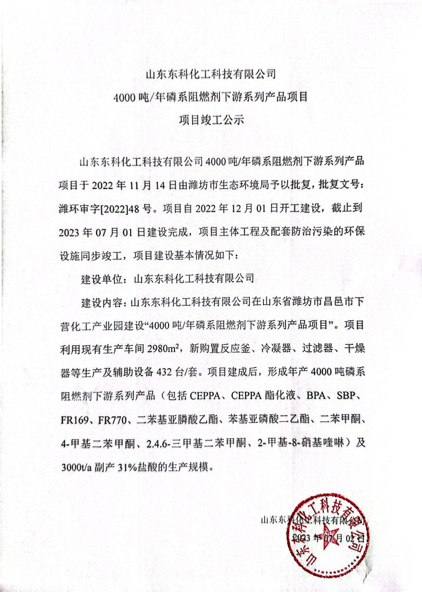 山東東科化工科技有限公司4000 噸/年磷系阻燃劑下游系列產(chǎn)品項(xiàng)目竣工公示